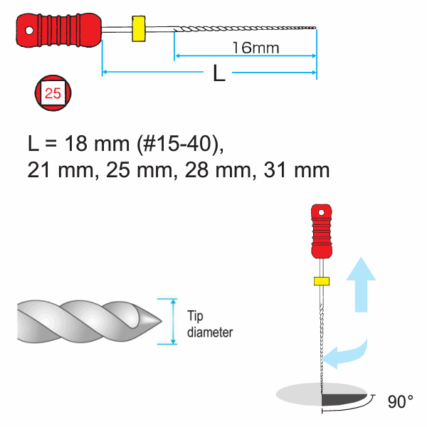Stor spiralvinkel (ca.90 grader) gir noe mindre skjærende effektivitet enn for reamer, med tynnere kuttespon. Gir veggene glattere overflate enn ved bruk av Reamer MANI. For større penetreringskraft benyttes D-Finder MANI. For kraftigere avvirkning, bruk NRT-fil . For å sikre bruddstyrken er K-filens tverrsnitt firkantet for #06-40 For å beholde fleksibiliteten er tverrsnittet trekantet fra #45-140. Arbeidslengde for alle typer: 16mm